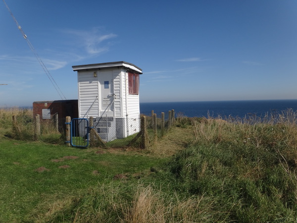 The going is easier as the path and cliffs head in a rough southerly direction for 0.6 miles from Hundale Point to Long Nab at TA092940, where the path passes landward of a white hut that was once the Long Nab Coastguard Station and Mine Shelter. After a third of a mile at Crook Ness the path curves to the right to head inland towards the end of a road; before it reaches the road the path turns left through a gap in a hedge and descends down stone steps to reach a concrete track in the gully bottom. Turn right along the track for about three yards, then left up more steps that leads out onto the cliff edge once more.