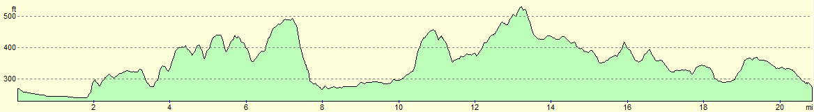 This makes a total distance of 20.9 miles, with 1411 feet of ascent and 1411 feet of descent.
